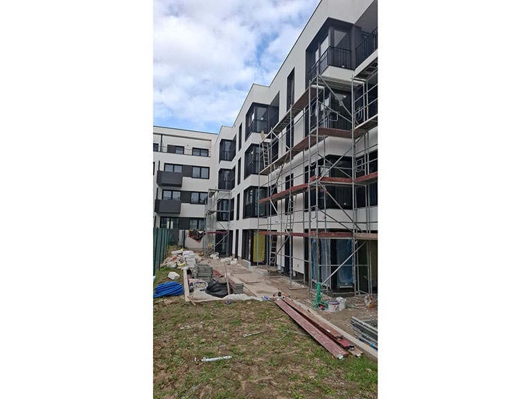 Etap 2a: peszle w stropie nad 2p. – 75%, peszle w stropie nad 2p. – 35%, okablowanie klatek schodowych – rozpoczęto, trasy kablowe garaż – 25%, okablowanie mieszkań parter – rozpoczęto.